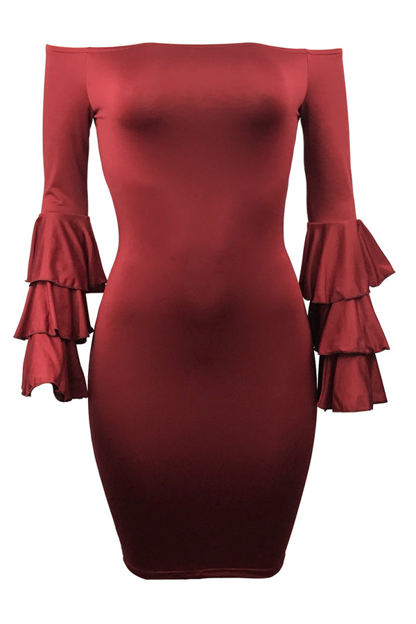 Stylish Dew Shoulder Long Sleeves Falbala Design Wine Red Polyester Sheath Knee Length Dress