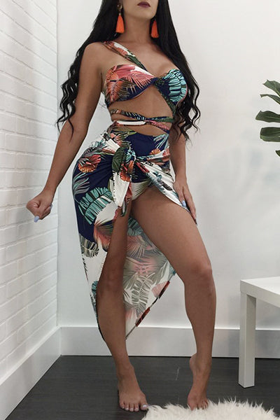 Sexy Printed Hollow-out White Milk Fiber Two-piece Swimwear (With Scarf)