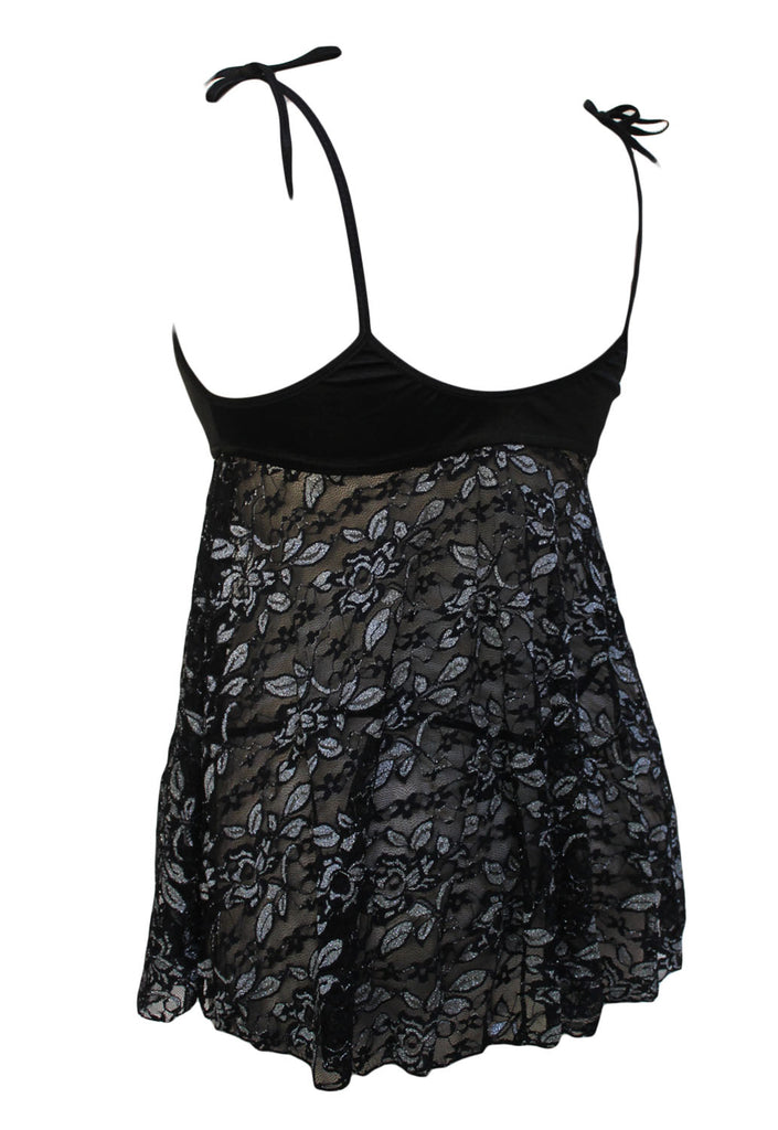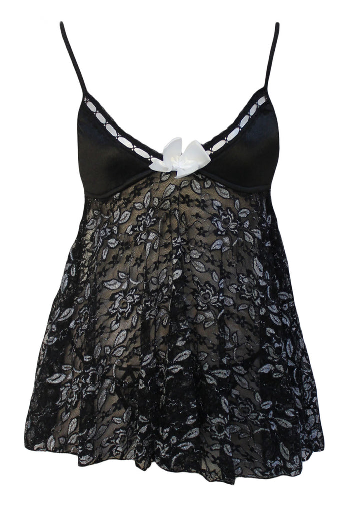 Black Silver Flower Babydoll with G-string
